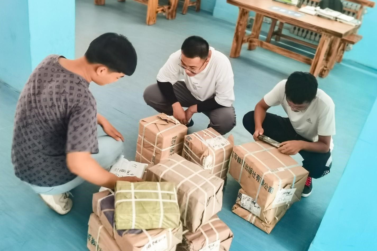 现场,相关负责老师下发教材清单,同学们有序搬运、拆封、分拣教材包裹,各班负责人自觉排队,经纸质登记、数目清点、现场核对等流程,有条不紊地领取到了教材。