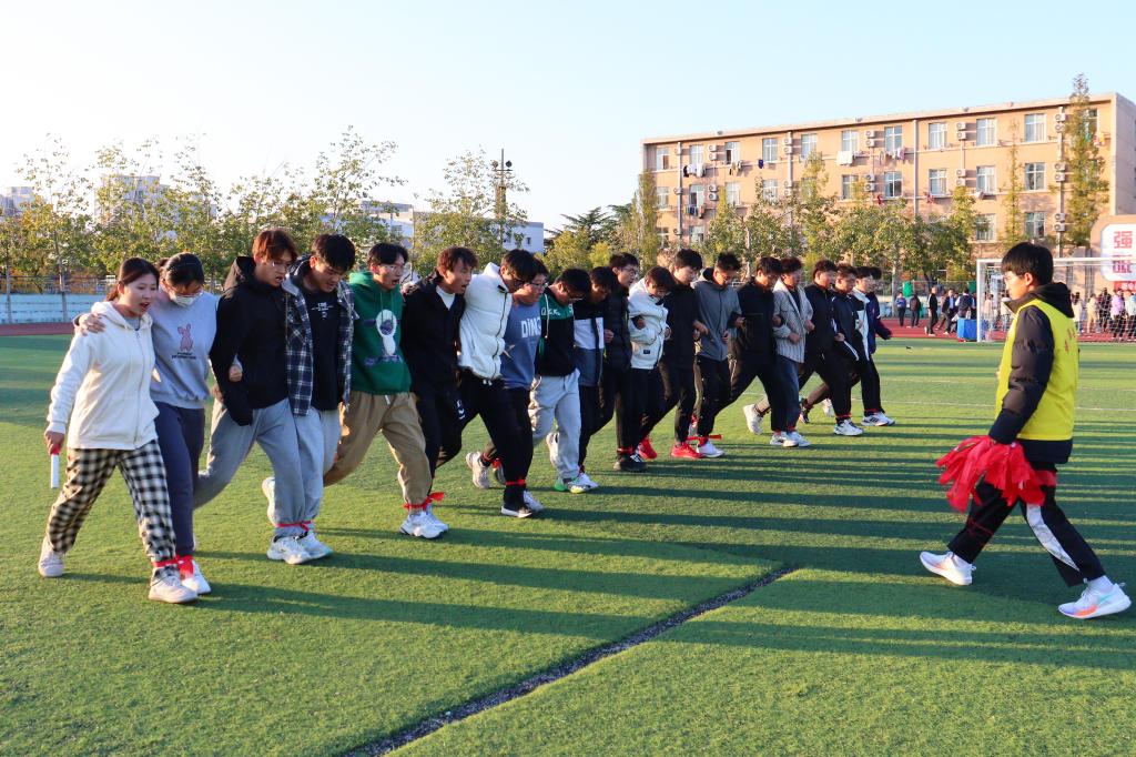 “十人九足”环节中,20名同学排成一横排,相邻两同学将腿绑在一起,大家步调一致,“一二一二”的口号声响彻操场上空。在“跳大绳”环节,两名同学甩绳,15名同学排成一纵列站于绳一侧,在跳动中尽情挥洒青春汗水。在“气球传纸杯”环节,同学们吹起气球,用嘴巴含住将气球撑起的纸杯在多名同学间传递,大家配合默契,轻松完成挑战。在“过河拆桥”环节,每组三块砖,手脚不碰地,全程借用这三块砖前进,携砖前进完成规定路程,并传递给下一名接力的同学。比赛中,大家手脚配合协调,迅速敏捷地完成接力挑战。