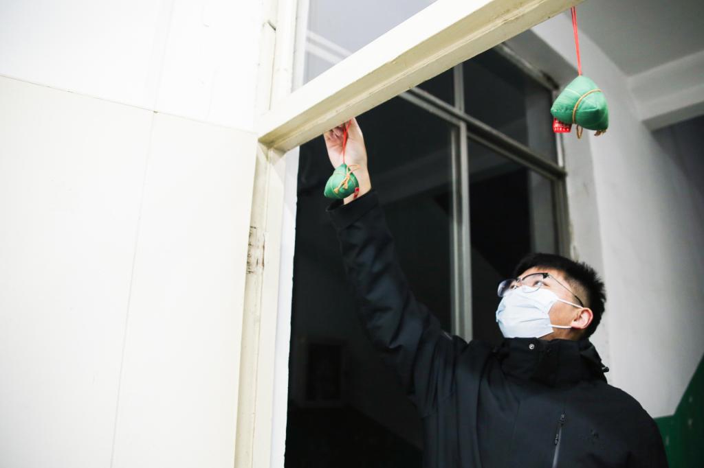 研战在即,一路高“粽”。志愿者将粽子形状的香包悬挂在考研自习室,寓意一举高中。