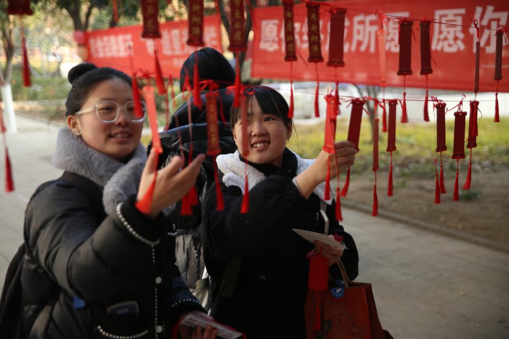 “学姐,这个福袋给你,祝你梦想成真哦!”“学长,这是咱们员工会定制的‘机票’,希望你能够成功上岸到理想大学”“学姐、学长,这是全体学弟学妹的祝福,愿你们以梦为马,不负韶华”……一句句温柔的祝福和一张张真诚的笑脸打破了清晨校园的宁静。