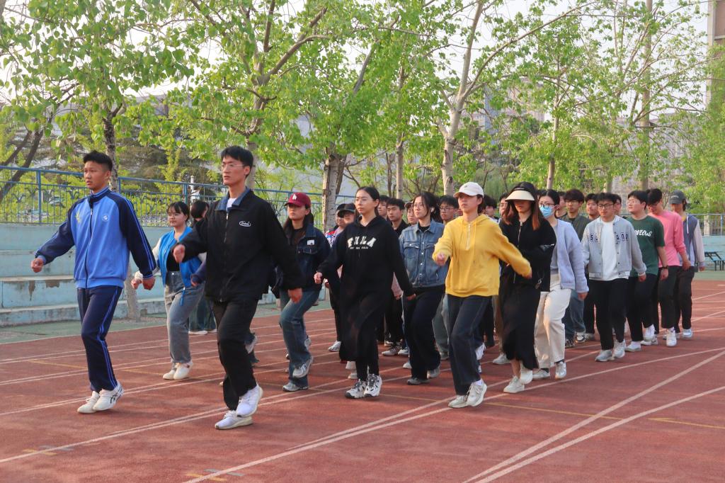 4月14日,公司学工办主任、团委书记洒艳及部分辅导员到操场指导运动会开幕式方队训练。