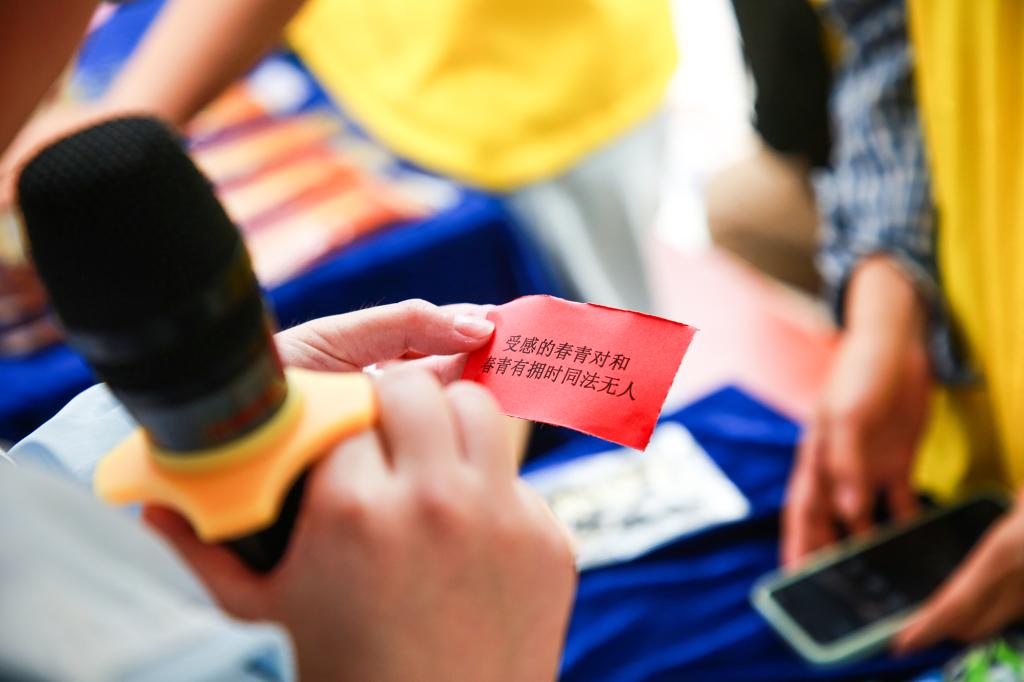 绕口令挑战区人声鼎沸,“黑化肥发灰,灰化肥发黑……”清脆念白与欢笑声交织。有的同学能够行云流水般快速念完,而有的同学虽磕磕绊绊,却依旧笑着重新尝试。在反话正说挑战区,毕业生们飞速转动脑筋,努力将卡片上的句子反向表达。创意与巧思在此激烈碰撞,通关的同学带着喜悦的笑容走向奖品区,留下一段段充满温度与趣味的独特回忆。