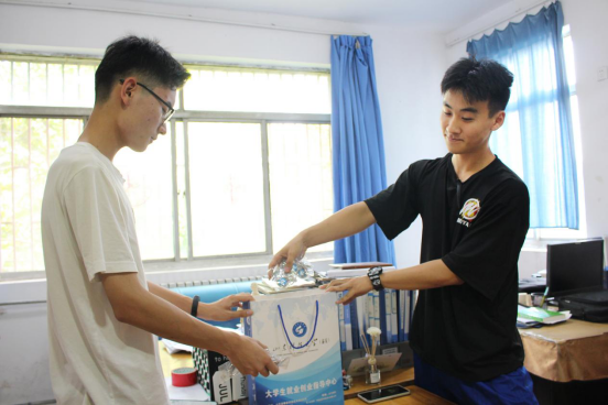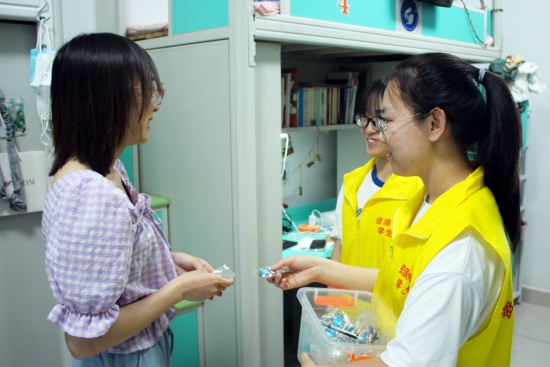 “学姐,请查收您的毕业礼物。”员工会成员走入毕业生宿舍,为他们送上精美钥匙扣。