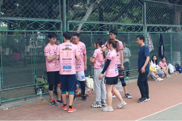 立身定发,稳健对局。团委辅导员尹发利老师稳定发球,带动全场节奏。