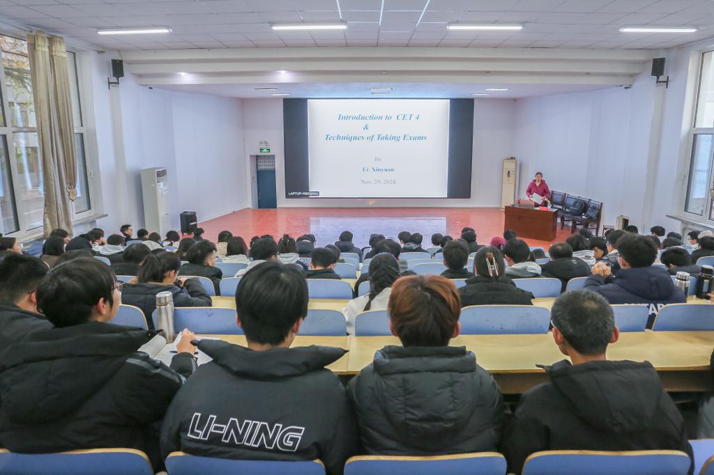 会上,李新元围绕四级考试安排、考试内容、应考技巧等方面展开讲述,详细讲解了考试的具体流程和题型分布。她强调,要着重加强对英语听力、阅读以及写作的练习,合理规划考试环节,把握答题节奏。她建议同学们平时要注重多增加课外阅读量和词汇储备,为提升应试能力打好基础,并结合自己在英语学习方面的经历,提醒同学们在考试期间要从容镇定,合理分配时间。