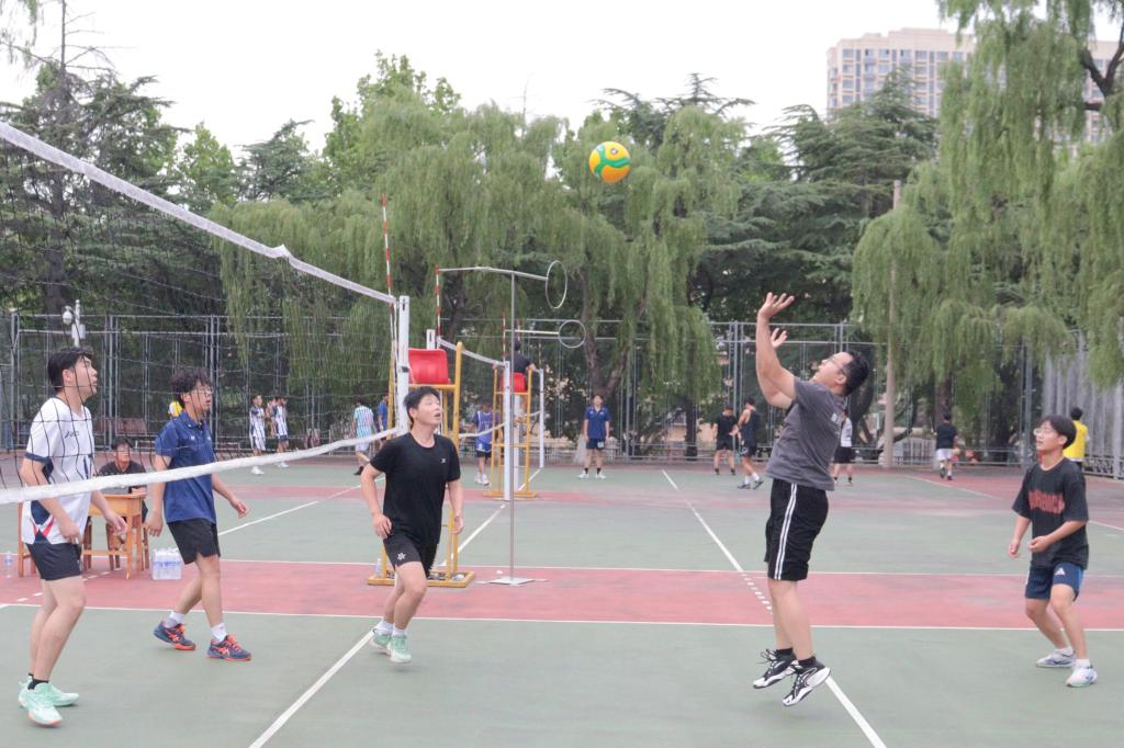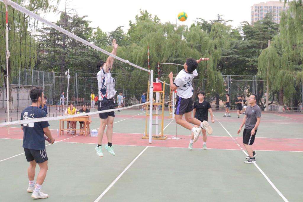 随着裁判哨声响起,比赛在双方队员的默契配合中迅速升温。发球手精准抛球、大力挥臂,排球如离弦之箭划破空气;二传手弓步下蹲、手腕轻抬,将球稳稳托向进攻位;主攻手起跳、扣杀一气呵成,排球带着凌厉的弧线直逼对方场地。师生们时而鱼跃救球、翻滚倒地,时而根据对手战术灵活变阵,比分在激烈对抗中交替上升。场下观众的欢呼声、加油声此起彼伏,将现场气氛推向顶点。